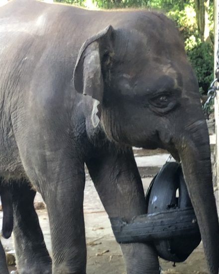NOTE THE IMAGE: The young, playful elephant got his leg stuck in the tire toy because he compressed it thus creating openings large enough for his leg, and when the compression pressure was release, he was stuck.