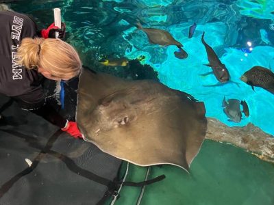 PRT promotes active mental engagement to learn a new behavior, like this ray learning to swim onto a stretcher